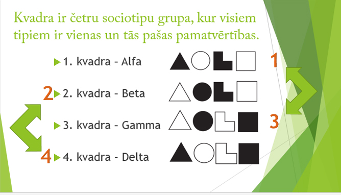 Pirmā divas Kvadras, socionikas literatūrā, tiek dēvētas par nenopietnām mīlestības ziņā, savukārt trešā un ceturtā kvadra – nopietnās. Kāpēc tas tā ir, to arī skaidrosim.